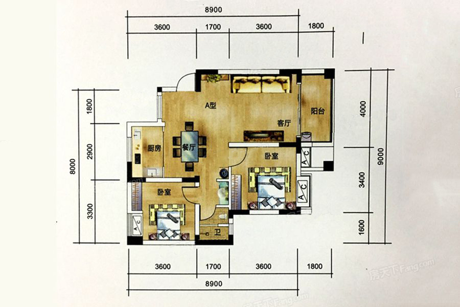 1#A户型-2室2厅1卫1厨建筑面积90.40平米