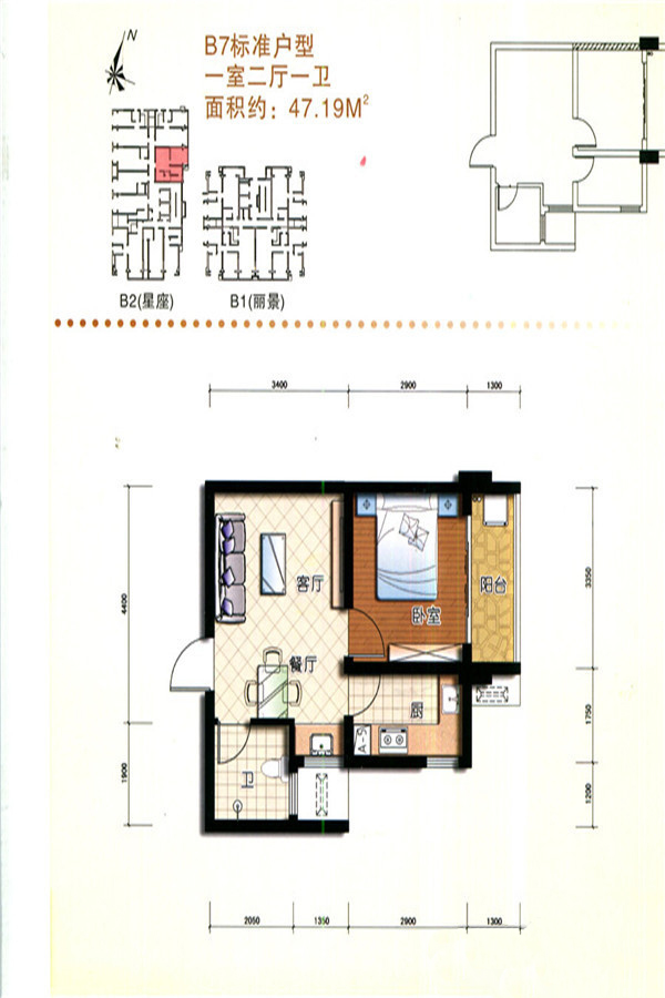 二期B栋标准层B7户型-1室2厅1卫1厨建筑面积47.19平米