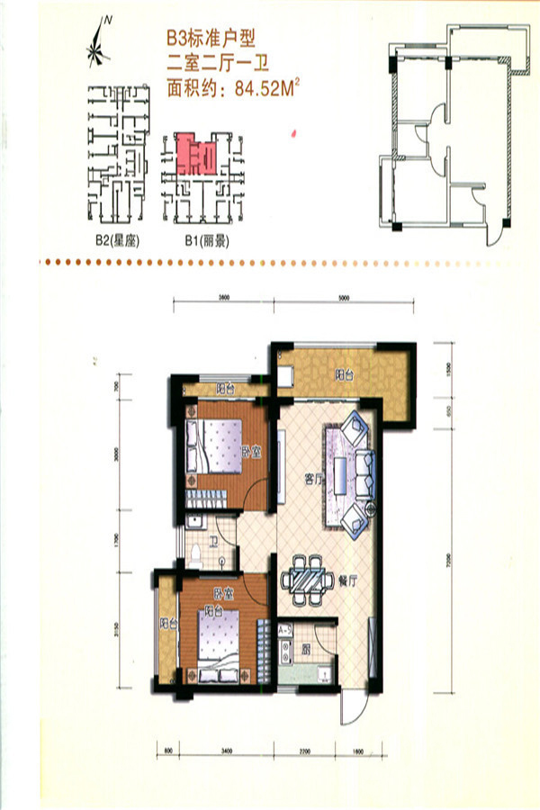 二期B栋标准层B3户型-2室2厅1卫1厨建筑面积84.52平米