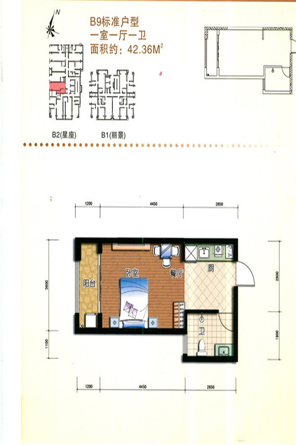 二期B栋标准层B9户型-1室1厅1卫1厨建筑面积42.36平米