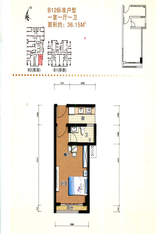二期B栋标准层B12户型-1室1厅1卫1厨建筑面积36.15平米