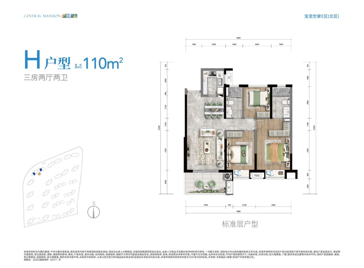 ?H户型——建面约110㎡三房两厅两卫