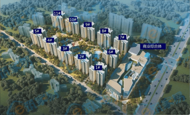 建筑布局:由 11 栋 15 层花园小高层及一个城市综合商业体构成,近百米的超宽楼间距。