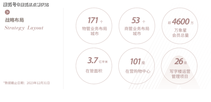 「万象服务」致力成为“最具影响力的城市空间运营服务商”聚焦社区生活空间、办公生产空间、城市公共空间,通过城市生态圈一体化运营与服务,运用科技智慧平台,整合城市资源、运营城市空间、服务城市人民,为人们带来更非凡的城市生活体验。 万象服务稳居物管行业综合实力第一梯队, 截至2023年底,万象服务布局全国171个城市,在管面积为3.7亿平方米,合约面积为4.25亿平方米。