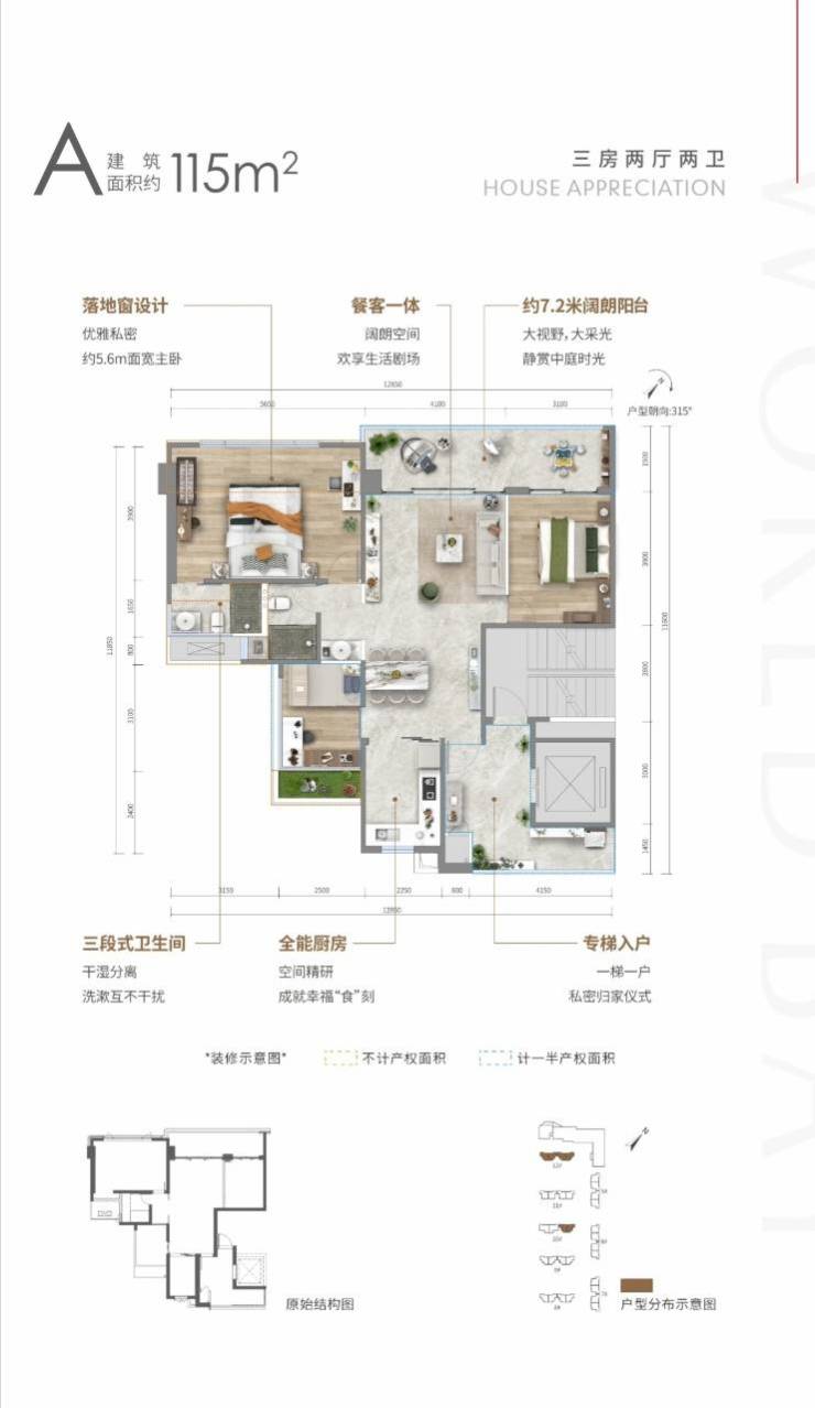 ?A户型: 约115㎡三房两厅两卫、层高22层