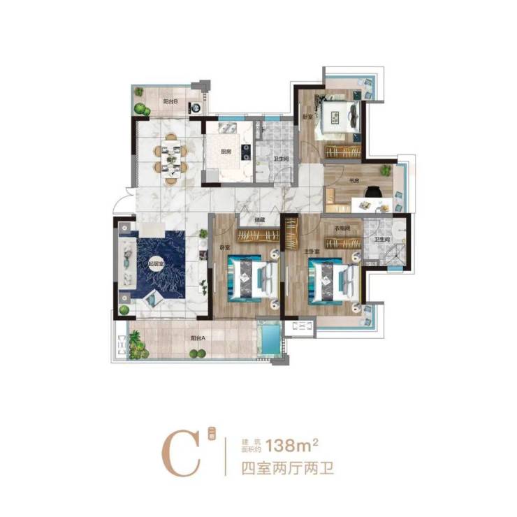 C户型亮点:金牌四房,奢华空间,宽景阳台规划温泉泡池
