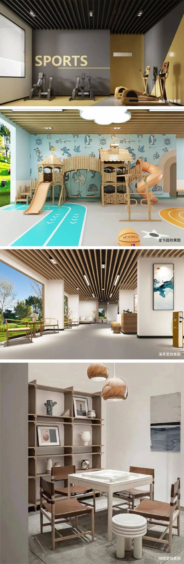 项目涵盖童乐园、微健身、溪茶室、棋牌室等九大架空层主题空间,满足不同年龄段的业主生活娱乐需求,其中器械健身区、乒乓球活动区及淋浴区;海洋球活动区、攀岩活动区、滑梯活动区、摇摇乐、木马等儿童区域;茶室与阅读区及棋牌区等,打造全龄化主题空间,让每一次回家都有欢笑时光。