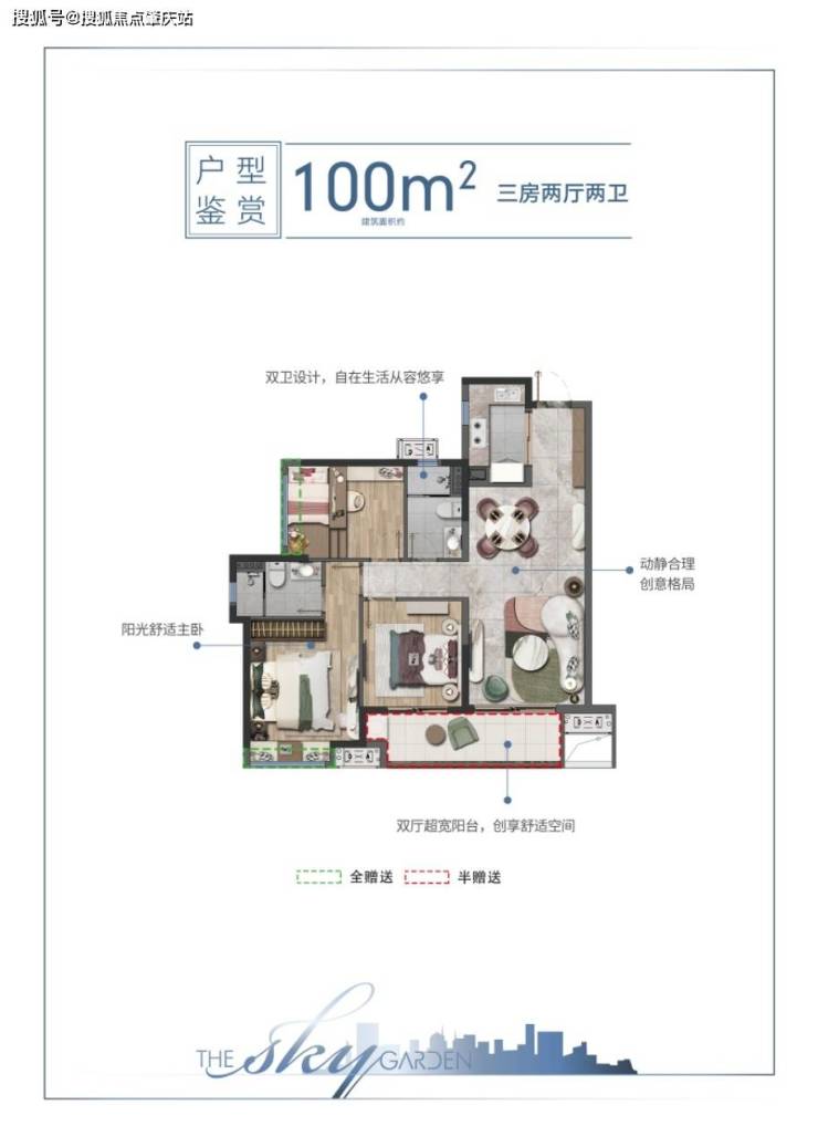 3房2厅2卫,建筑面积约:100㎡↑户型优势:纯板式设计,南北通透,清风对流;次卧连接阳台,畅通出入,随心定制;多功能宽阔阳台,拓展居家活动空间;L型高效洗煮切厨房,餐客厅一体,居家美味加速传递。