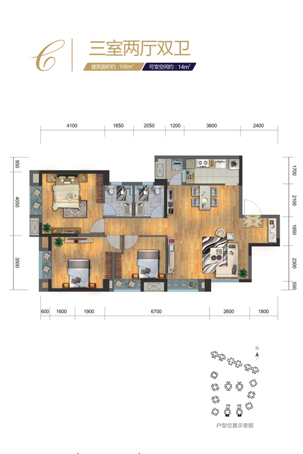 8、9栋标准层C户型-3室2厅2卫1厨建筑面积105.00平米
