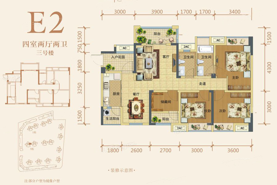 3号楼E2户型标准层-4室2厅2卫1厨建筑面积114.00平米