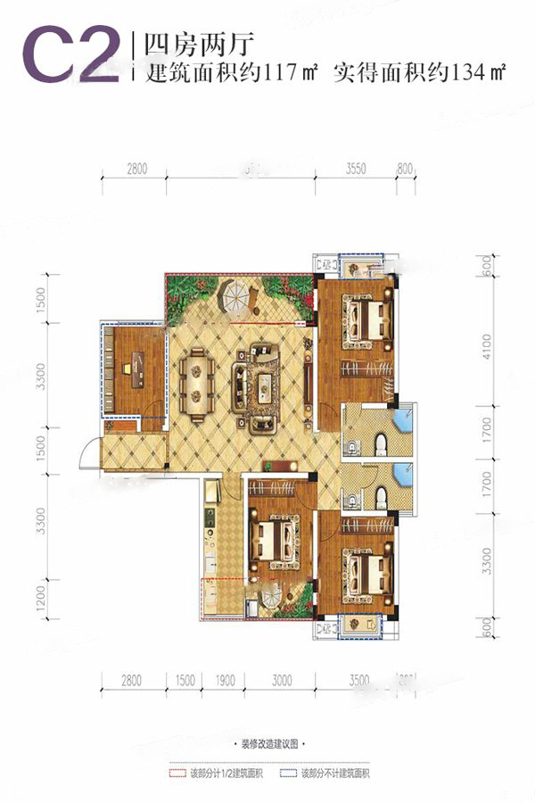 C2户型图-4室2厅2卫1厨建筑面积117.00平米
