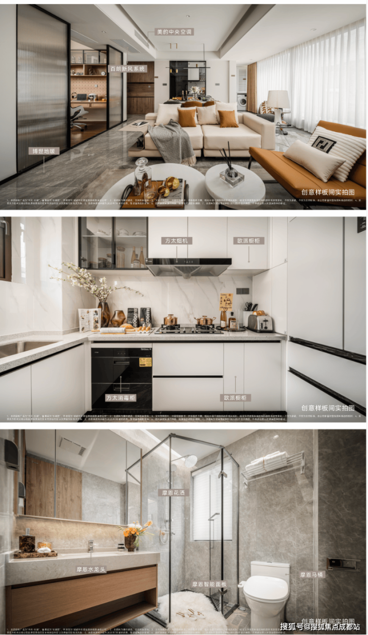 项目全屋精装交付,严选一线精装品牌、百搭暖系配色、厨卫柜体一应俱全。三大件选用国际一线品牌:美的中央空调、博世地暖、百朗新风系统;厨房采用方太的橱柜、方太烟机灶具外,更贴心的配备了方太的消毒柜,保障家人健康。