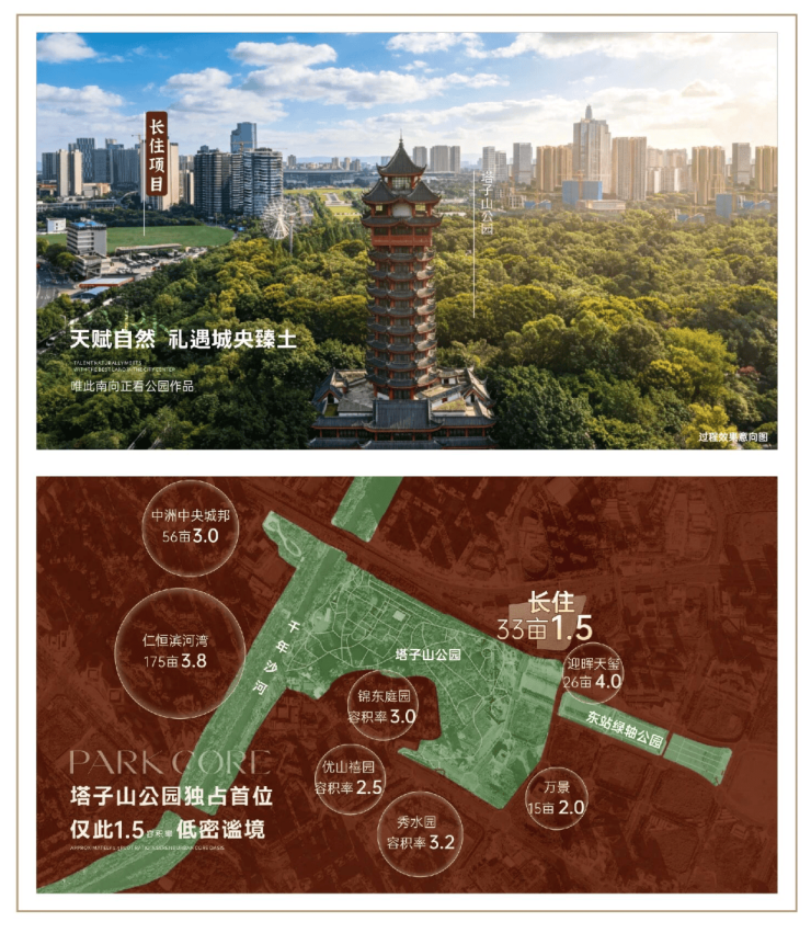 从城市维度看,项目巧妙平衡了内外关系:东西中轴构建的繁华于外,项目本身营造的静谧于内,塔子山公园与东站中轴绿廊构成的“后花园”则形成了东方礼序的大格局。