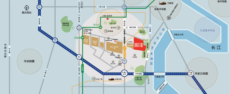 项目自带70万方的产商办公区域,九宫庙商圈已基本成型,目前已有新天泽购物中心、香港城、春光购物中心、国瑞购物中心等大型商场。落户大渡口区的大渡口万达广场和华润万象汇纷纷开业,本项目与九宫庙商圈不到两公里的距离,万达广场距离项目约1.5公里,同时距离项目最近的轻轨站:轻轨2号线新山村2公里,规划21号线站点就在我们产业三期门口,