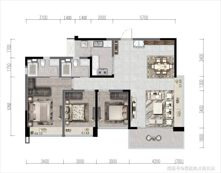 C户型 建面约142㎡ 四室两厅两卫(西北朝向)