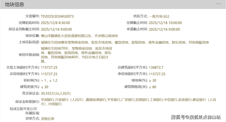 11月19日,顺德大良挂牌一宗宅地,占地约11.57万㎡,地块起拍价152760万元,折合起拍楼面价11000元/㎡,将于12月18日进行网拍。