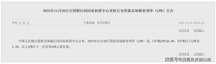 11月20日,中国人民银行授权全国银行间同业拆借中心公布,2025年11月20日贷款市场报价利率(LPR)为:1年期LPR为3.0%,5年期以上LPR为3.5%。以上LPR在下一次发布LPR之前有效。
