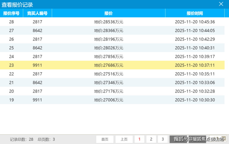 此次竞拍经历了28轮出价,总价从23776万涨至28536万,溢价率达20%。