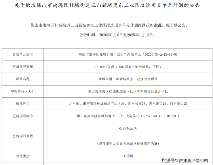 近日,佛山市自然资源局南海分局发布关于批准佛山市南海区桂城街道三山新城奕东工业区改造项目单元计划的公告。