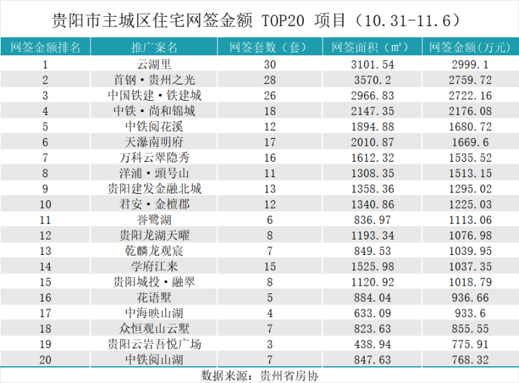 据贵州省房协统计数据,2025年10月31日至2025年11月6日,贵阳主城六区住宅网签金额榜单中: