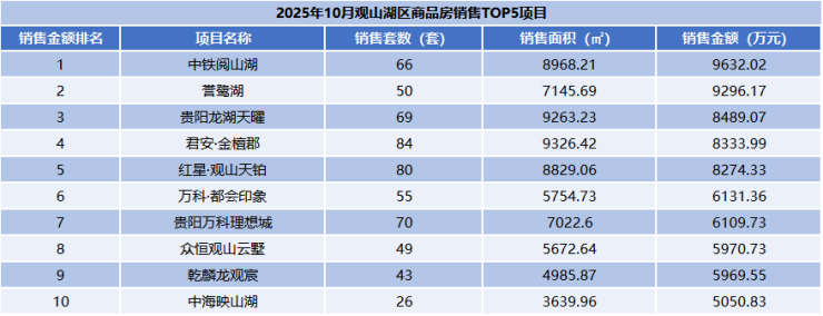 榜单再往下,观山湖区的项目开始成为主力,中铁阅山湖、誉鹭湖、龙湖天曜、盼盼金檀郡、远洋观山天铂等项目商品房销量均超过了50套,表现相对来说比较均衡。