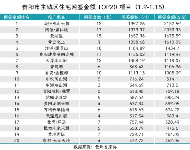 据贵州省房协统计数据,2026年1月9日至2026年1月15日,贵阳主城六区住宅网签金额榜单中:
