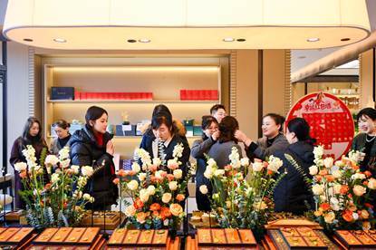 据工作人员介绍,售楼处举办的展览、沙龙在两天前刚刚结束,潮宏基珠宝的非遗艺术品鉴会,展销高端零食、品质生鲜的风味年货节,均是为“返乡置业”准备的特别活动,很多购房者正是被活动吸引而来。