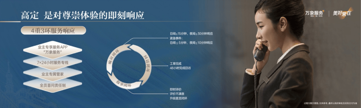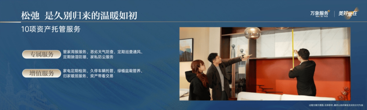 第四重价值升维:引领行业“润泽美好”的礼仕服务。作为城市开发运营商,华润置地将多元资源优势注入服务体系,以“高端礼仕服务”为核心,覆盖从生活到资产的每一个关键触点,秉持高效(Speed)、私密(Secrecy)、专属(Specialty)、雅致(Subtlety)的4S理念,将769项严苛标准内化于无形的日常守护之中。7x24小时全场景咨询、快递外卖直送家门、晚归专属护送等,确保便利与安全。在资产维护层面,涵盖外墙定期清洗、大理石专业养护、水箱清洁及水质检测等,保障物业的长期保值。更具前瞻性的是资产托管与房屋空置管理服务,它为高净值客户频繁的差旅与海外生活提供了解决方案,让家始终处于最佳状态。