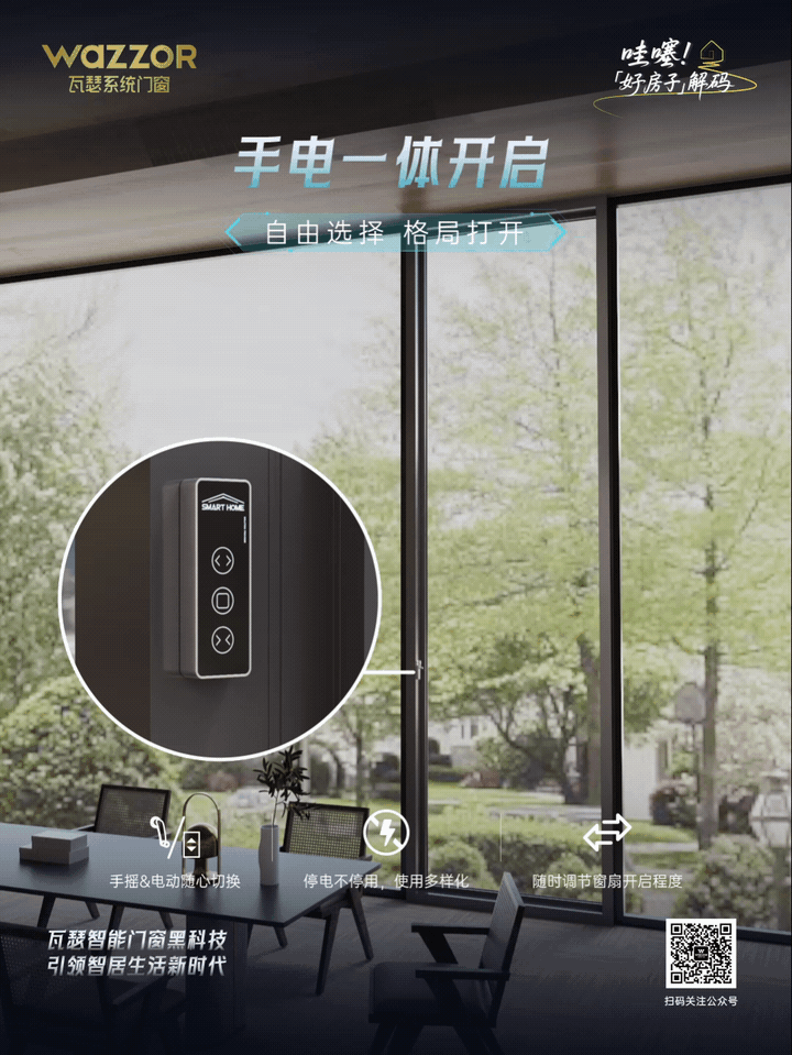 针对不同场景,瓦瑟提供了多元的智能解决方案:WAZ 37 RBW 电动升降阳台窗配置智能控制面板,一键控制窗扇/纱窗启闭、自定义开启行程、儿童安全锁、智能新风等,还能通过遥控、语音等方式实现开启;WAZ 115 POW 手电一体平推窗,手电一体的开启设计,即便是5米高的窗扇也能轻松开启。
