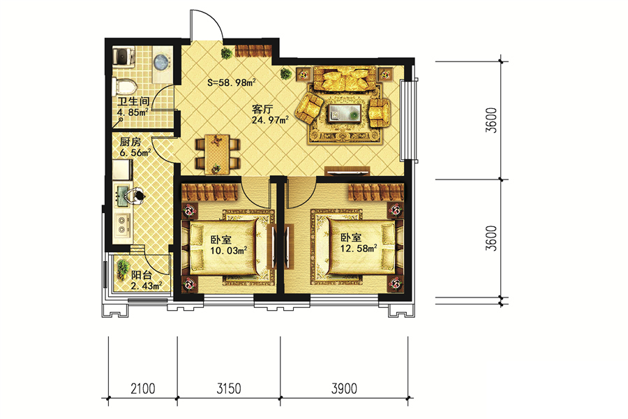 15号楼使用面积58.98平东南向-2室1厅1卫1厨建筑面积94.37平米