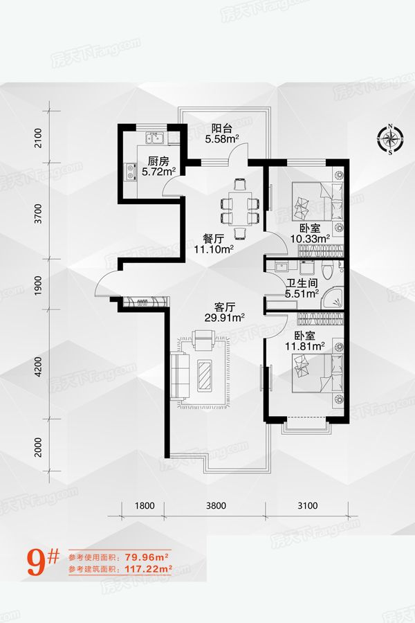 9#-03户型-2室2厅1卫1厨建筑面积117.22平米