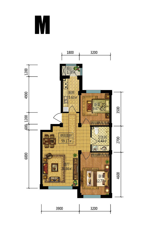 M户型-2室1厅1卫1厨建筑面积75.88平米