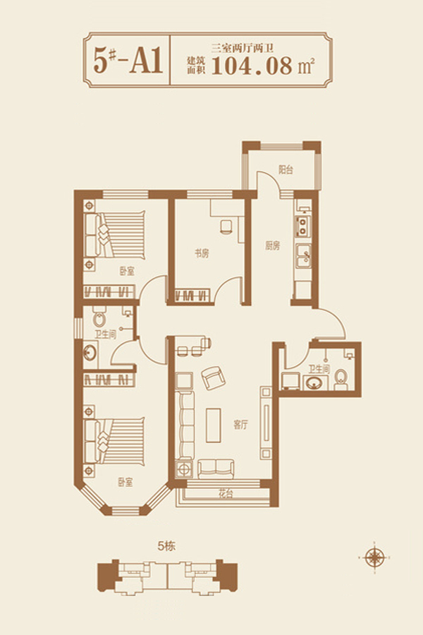 5栋A1户型-3室2厅2卫1厨建筑面积104.08平米