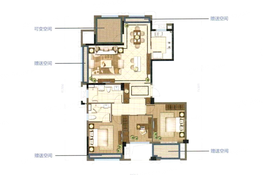 E1户型138方-3室2厅2卫1厨建筑面积138.00平米