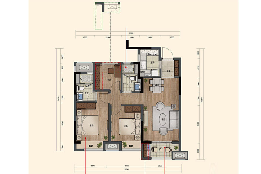 卧室:主卧朝南,带衣帽间和独立卫生间。 卫生间:双卫生间设计,干湿分离。 玄关:玄关入户,带收纳功能。