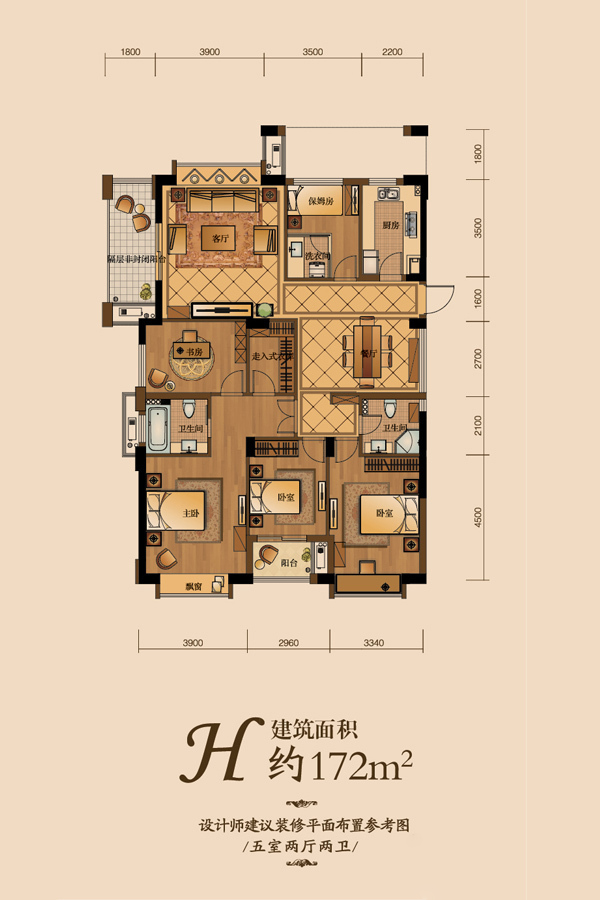 172方H户型-5室2厅2卫1厨建筑面积172.00平米