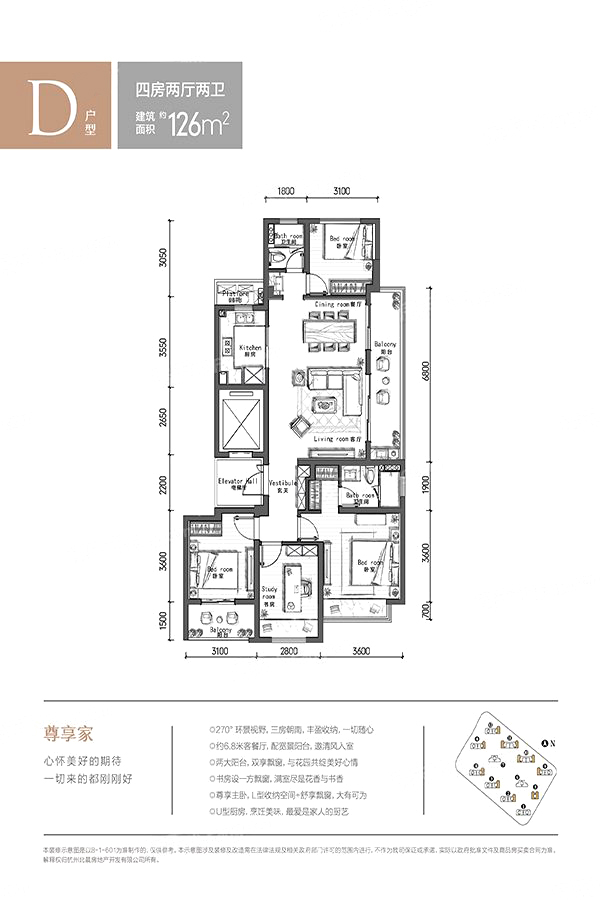 D户型126方-4室2厅2卫1厨建筑面积126.00平米