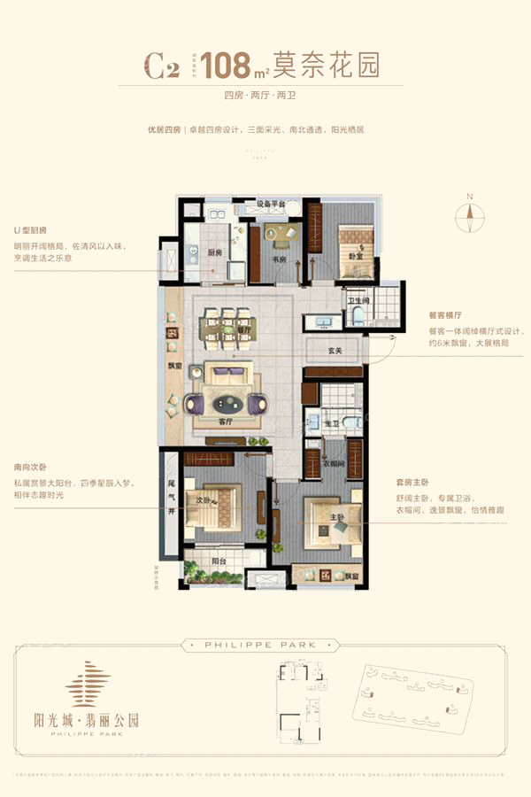 C2户型-4室2厅2卫1厨建筑面积108.00平米