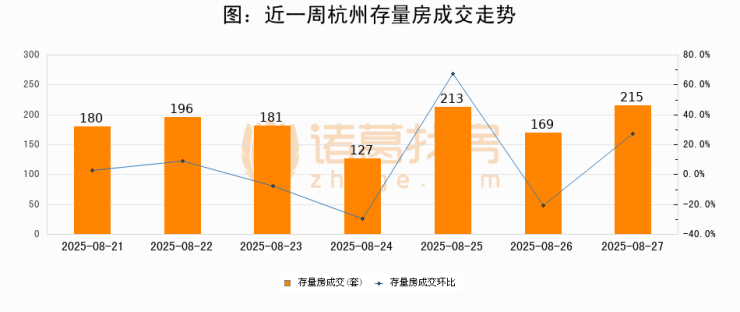 从存量房来看,2025年08月27日杭州存量房单日成交215套,比昨日增加46套,环比上涨27.2%。从近一周存量房成交来看,杭州存量房日均成交套数为183套,08月27日单日成交215套,高于近一周平均水平17.5%。
