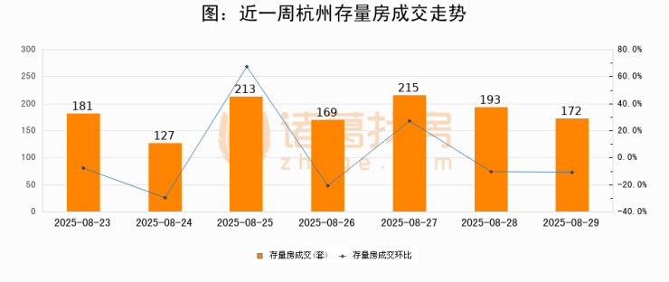 从存量房来看,2025年08月29日杭州存量房单日成交172套,比昨日减少21套,环比下降10.9%。从近一周存量房成交来看,杭州存量房日均成交套数为181套,08月29日单日成交172套,低于近一周平均水平5%。