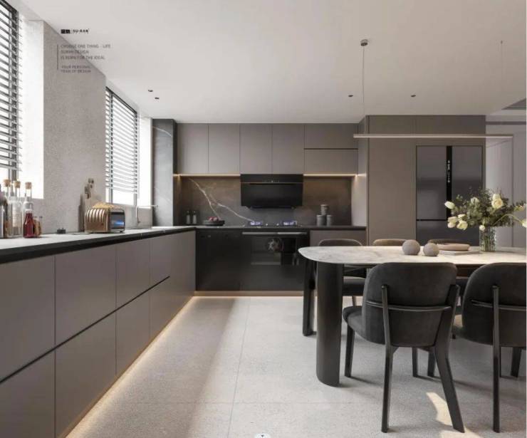 开放式的L型厨房设计,与餐桌的结合,让空间利用率得到了更高。流畅的线条,舒适的空间氛围,大理石餐桌散发着高雅的气息,将空间里的温度保持在最清新的状态,唤醒你的味蕾。