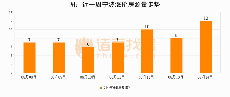 根据诸葛找房数据显示,宁波24小时涨价房源量为12套,较08月13日增加4套,环比上涨50%。与此同时,涨价房源占比小幅扩大,业主信心有所提升。