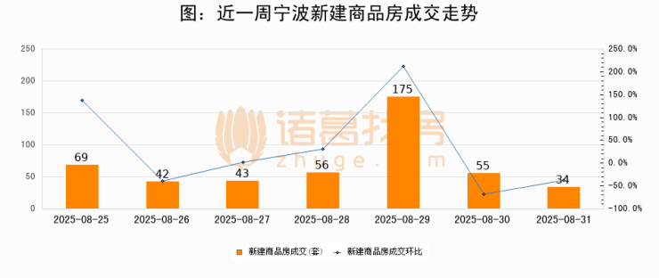 根据宁波市房产市场管理中心数据显示,2025年08月31日宁波新建商品房成交34套,较昨日减少21套,环比下降38.2%。近一周宁波新建商品房日均成交68套。08月31日单日成交34套,低于近一周平均水平50%。
