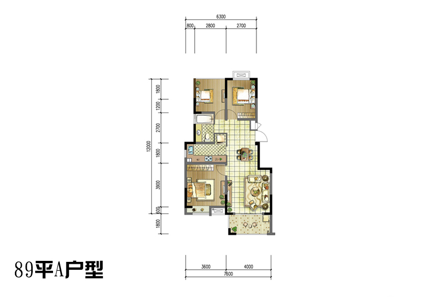 一期04幢标准层A户型-3室2厅1卫1厨建筑面积89.00平米