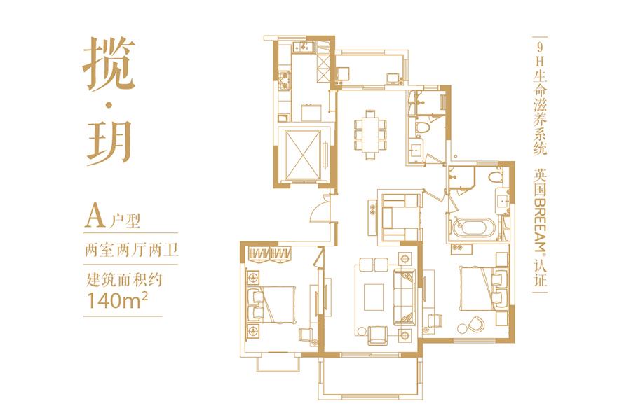 一期3#标准层揽·玥A户型-2室2厅2卫1厨建筑面积140.00平米