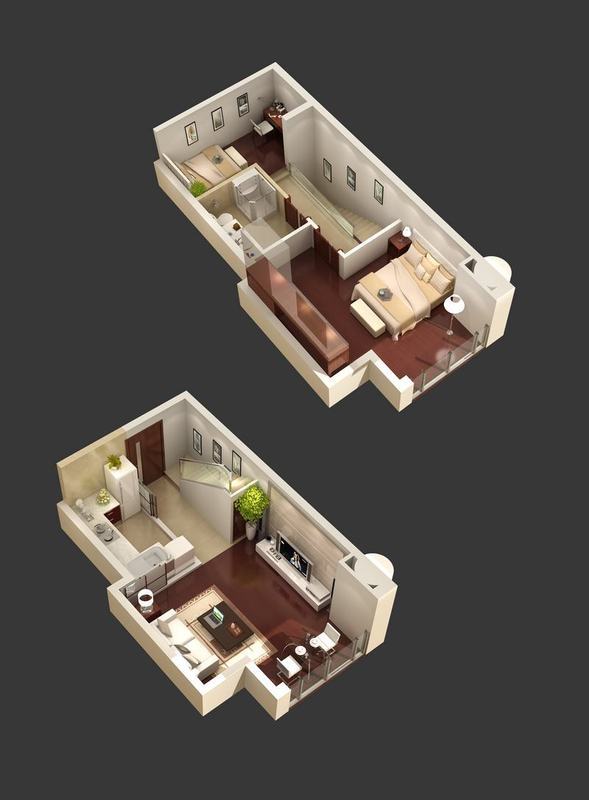 一期公寓47平米A1户型三维图-一期公寓47平米A1户型三维图-2室2厅1卫1厨建筑面积47.00平