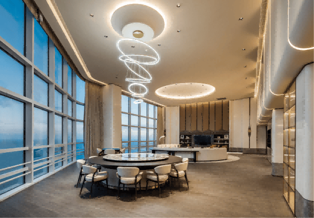 空间承载雄心,设计赋能未来。活动现场,39-40F“云端会客厅”样板层首次揭开面纱。区别于传统办公布局,项目创新打造“共享层”理念,以「功能适配+美学赋能」为核心,构建全维度高端商务生态。