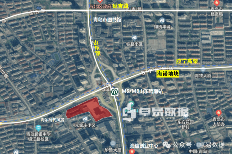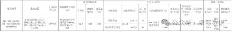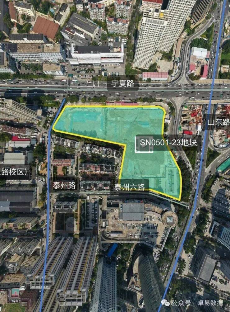 地块位于市南区泰州路以东、宁夏路以南、山东路以西、泰州六路以北SN0501-23地块,占地29795.5㎡,容积率2.9,规划建筑面积8.64万㎡(计容建面85950㎡,4700㎡托育所不计容),其中出让部分建面80800㎡,商住比32:68(住宅部分53200㎡、商业服务业27600㎡),此外划拨教育用地3150㎡、体育用地2000㎡,起始楼面价12562元/㎡,起拍总价10.15亿,其中住宅高度不超80米;商服高度不超100米。