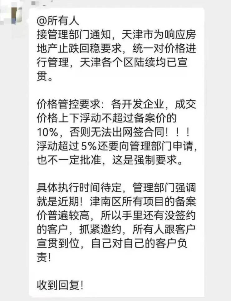 通知称,住建部门将统一对天津市新建商品房的销售价格进行管理,以响应房地产市场“止跌回稳”要求。