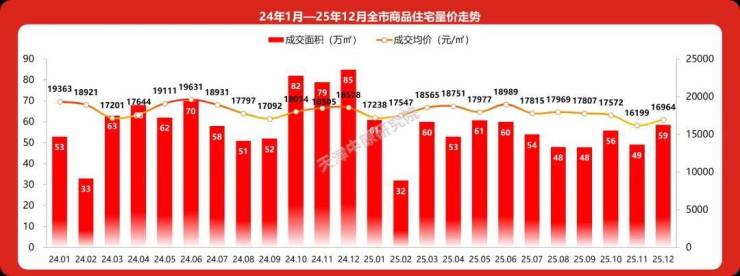 2025年12月,天津市新房共成交58.5万平方米,成交均价环比增长5%。